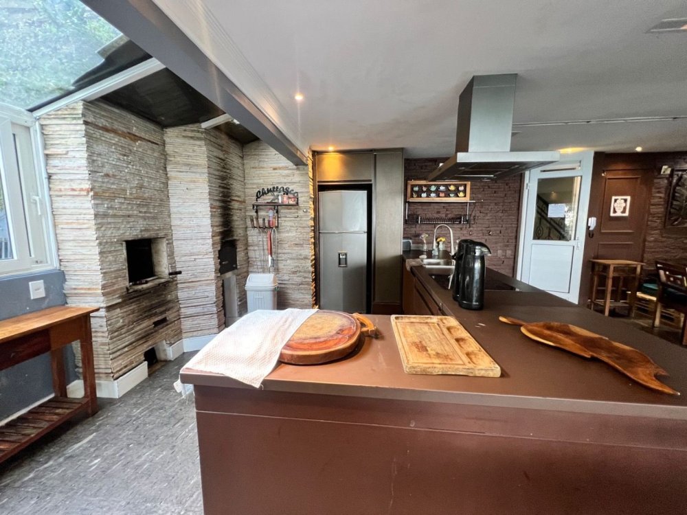 Salão de festas com churrasqueira e forno de pizza