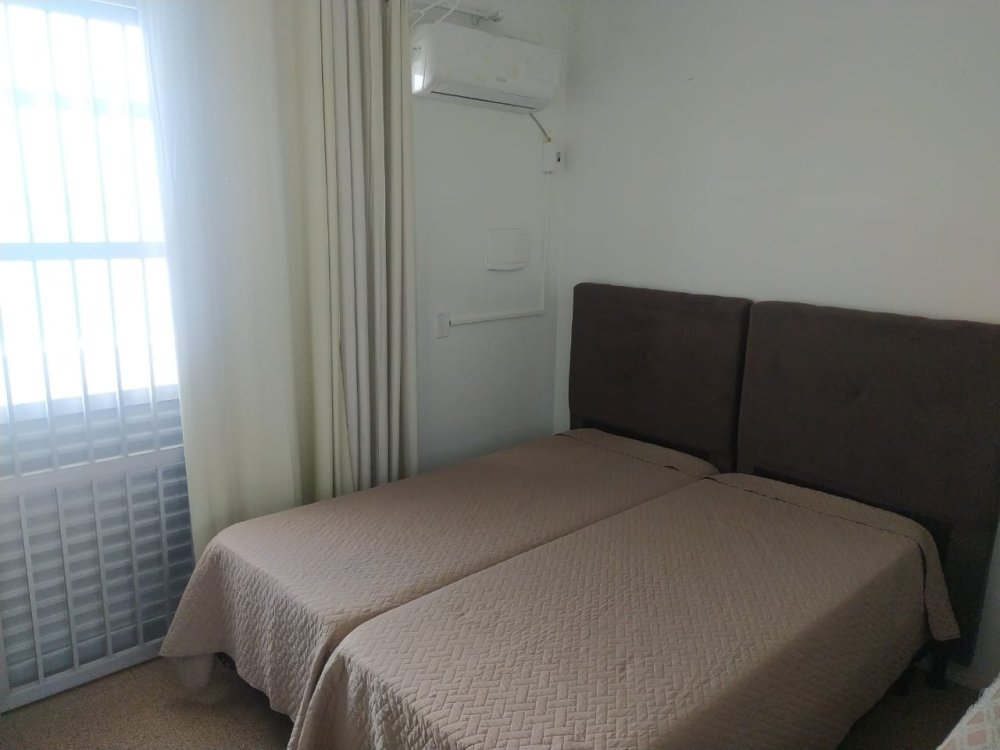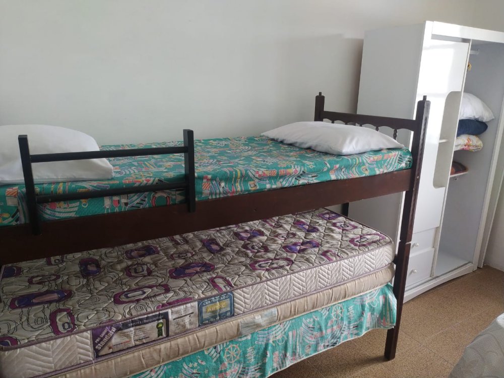 3 quartos, sendo 1 suíte; (3 camas de casal e um beliche)